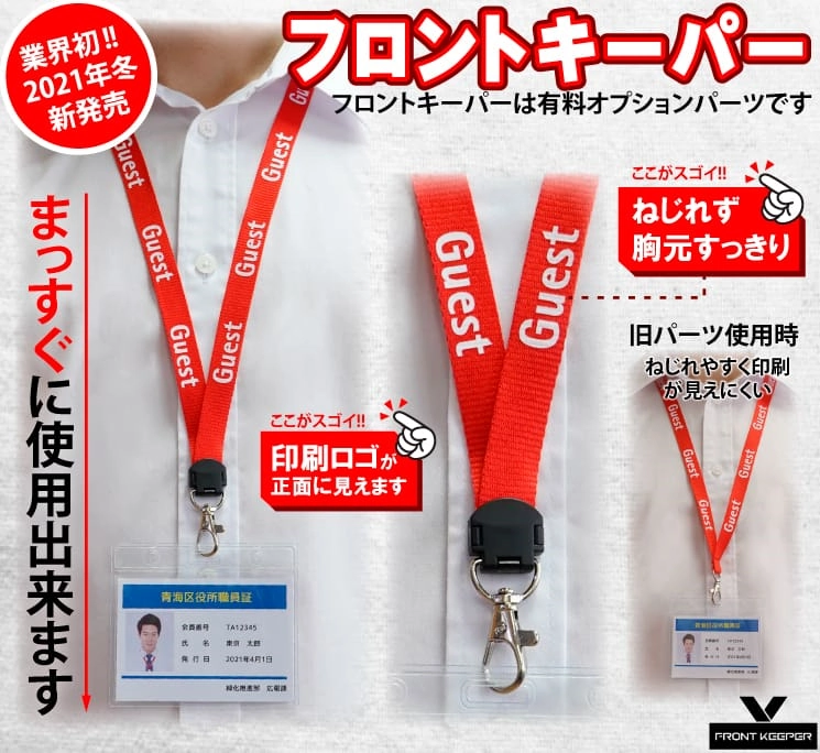 このクリップは、ネックストラップ本体から、IDカードホルダー部分を簡単に取り外すことのできる部品です。取り外したIDカードホルダーに社員証などを入れ、シャツの胸ポケットに挟み、カードホルダー単体としてもご利用頂けます。有料オプションとなります。価格はオプションパーツ価格一覧をご覧下さい。