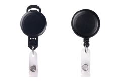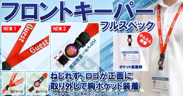 IDカードホルダー部分を簡単に取り外すことのできます。ストッパーにスライドカバーが付いていますので簡単に開閉します。 カードケースの不意な落下を防止や、絶対に無くせない身分証等の吊り下げに適しています。また先端を取り外して胸ポケットに装着する事も可能です。 クリップにロゴを印刷することができます。(直径約20mm)透明エポキシ樹脂のドーム加工がされ高級感があります。 価格はオプションパーツ価格一覧をご覧下さい。